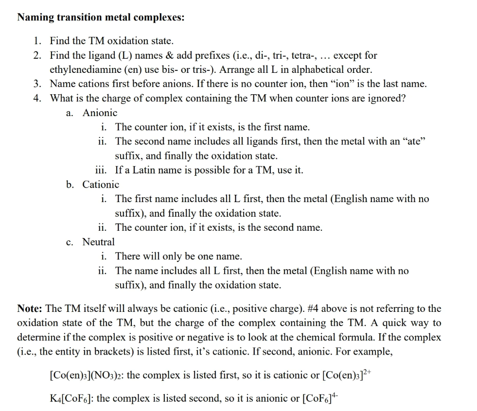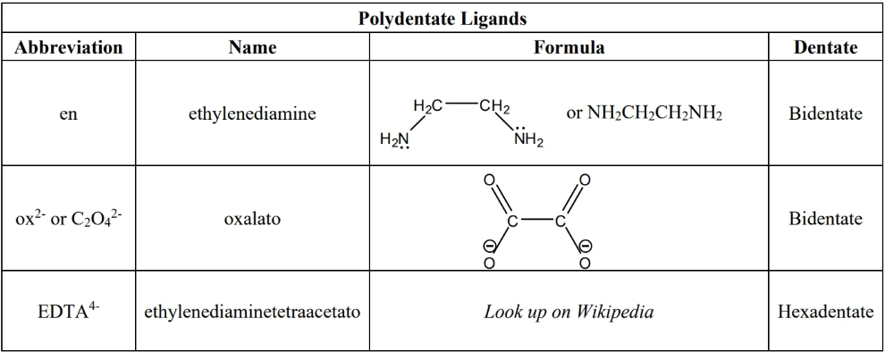 - coordination number: the number of neighbors to the transition metal ion; bidentates = 2 and so on; neighbors usually just means ligands in this course