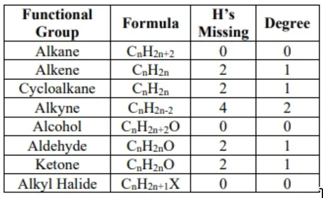 - degree = (number of hydrogens in alkanes - number of hydrogens in species) / 2