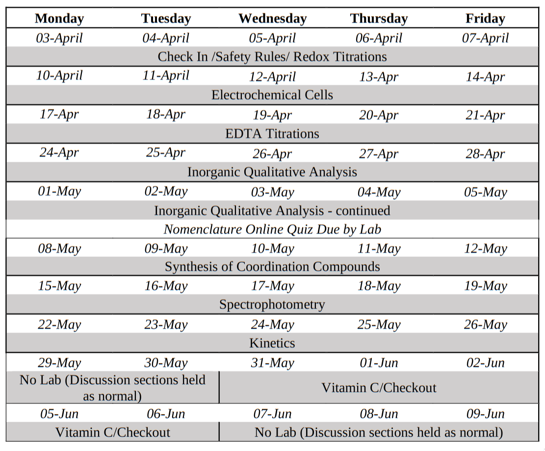 - Missing lab (unexcused) means failing the class. Make up within a week in another section.