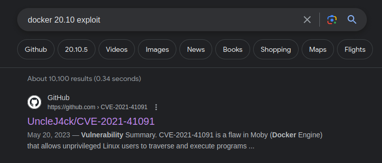 Google comes to the rescue with a relatively new PoC for Docker. The vulnerability seems to be related to the container filesystems, which are not properly isolated from the host filesystem, granting access to regular users. If there’s any exploitable (GTFObins) setuid binary in the container, then that could be a privesc vector on the host machine as well.