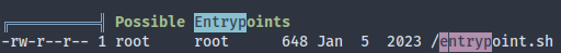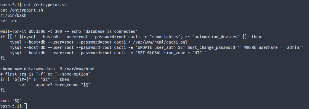There’s no docker binary available, so it might not be about escaping docker. In that case let’s try to gather as much info as we can here. A little further in LinPEAS output we can see an entrypoint.sh which gets automatically executed when the container is started.