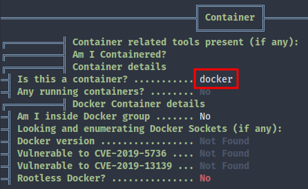LinPEAS says that we’re in a container (which is also apparent from /.dockerenv):