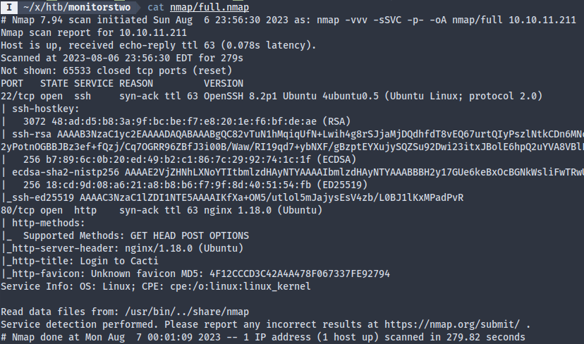 A full nmap scan reveals only two services, SSH and HTTP. The web server seems to be running Cacti.