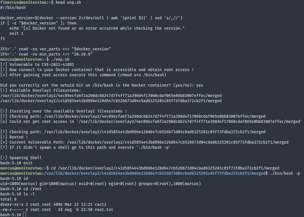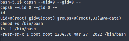 The script seems to require a setuid bit on the container’s /bin/bash, which we can easily achieve. LinPEAS revealed that capsh is a setuid binary in the container, which enables us to privesc to root: