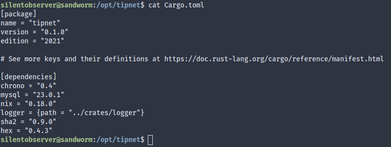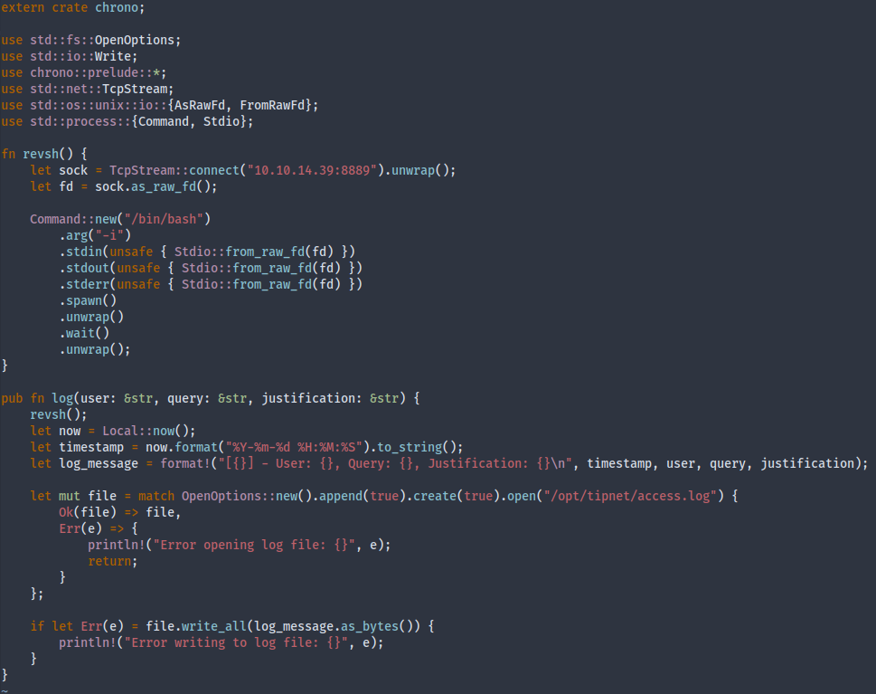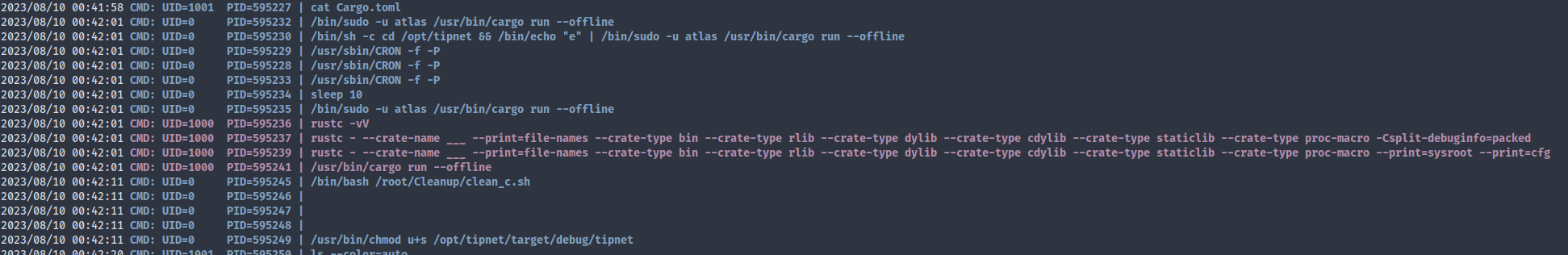 From pspy output, we can see that the tipnet binary gets compiled, set as SUID, and executed by a cronjob; which means that we can just insert a reverse shell into the logger crate to pivot to atlas.