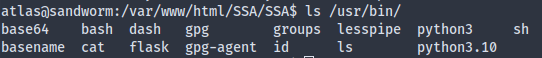 The webserver runs Flask and uses the Jinja templating engine, for which HackTricks has an excellent cheatsheet. I used {{ config }} to confirm the SSTI vuln and got the atlas user’s MySQL password, though unfortunately it wasn’t reused for SSH. I then dumped a list of classes using {{ dict.__base__.__subclasses__() }} so that I could determine the index to subprocess.Popen(), which turned out to be 439. The most annoying part of gaining foothold is to find a payload that works. It seemed that the remote is running either a restricted bash or chroot jail, since I couldn’t even use wget and curl. Bash reverse shells won’t work directly since redirection symbols aren’t allowed in the name field of a key. Python3 payload somehow wasn’t working at all either. At last I used a base64 bash revshell payload to get around the name field restriction.
