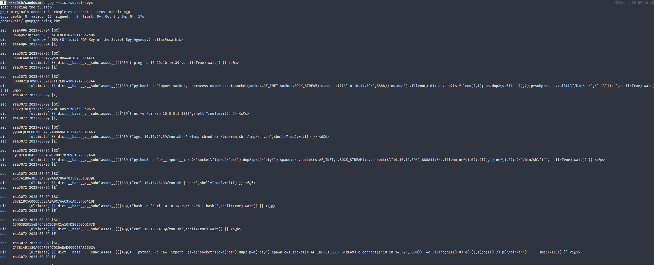 To be frank I didn’t know where I should begin for getting foothold, mostly because I straight up didn’t interact with the signature verification form at all, only after seeing a mention of SSTI on the HTB forum did I begin to test the third pair of textboxes. The user can control the name, comment, and email portion of the gpg command output, which is set at the creation of the public key. Out of the three, name is the most malleable (no < or >), whereas comment disallows parentheses (which disables function calls) and the email field has to be in a valid email format (has to contain @ to start off).
