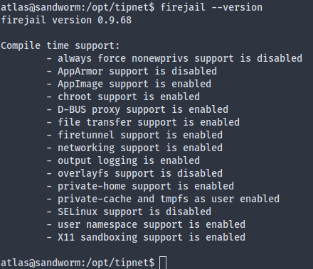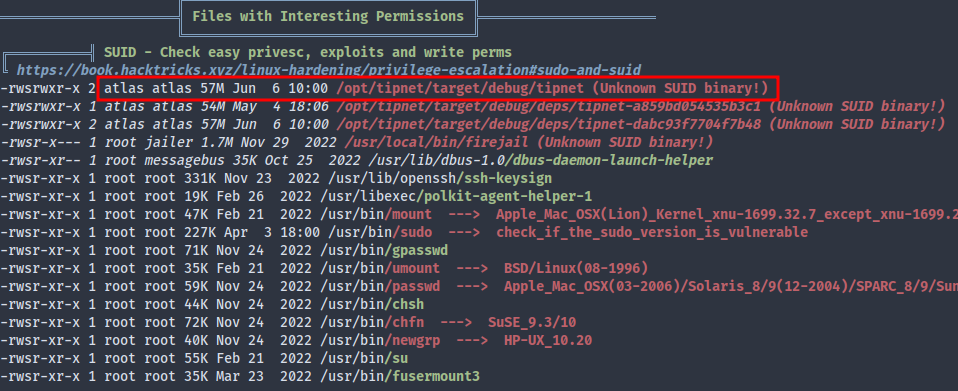 In a routine LinPEAS scan I discovered a weird SUID binary tipnet, though the owner is atlas. Apart from that, we also have firejail, though we can’t execute it because we’re not part of the jailer group.