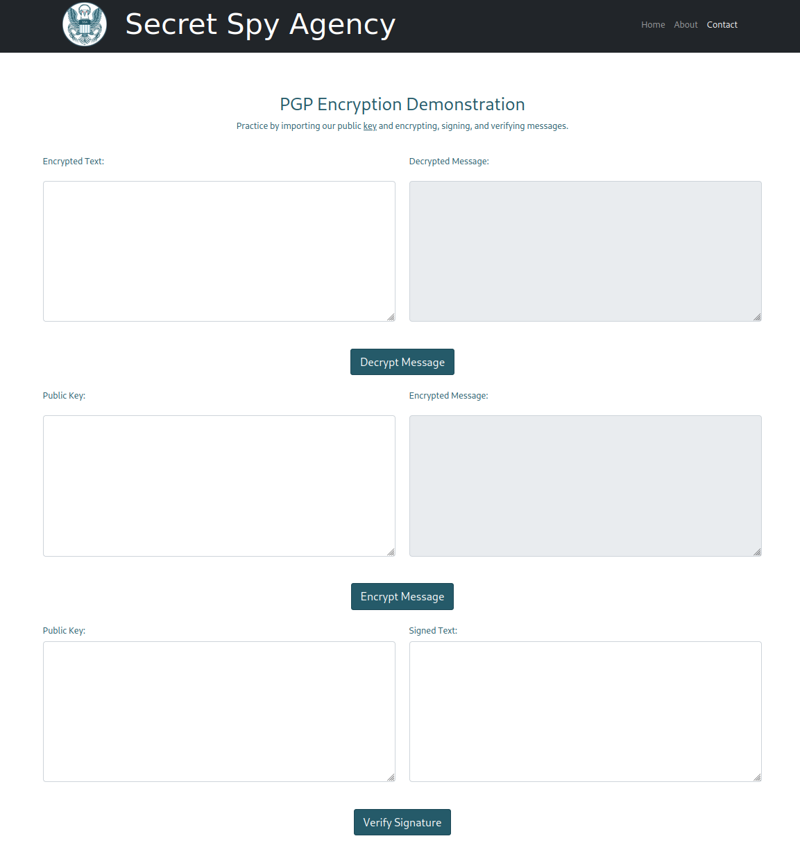 - The first pair of textboxes lets you decrypt any message encrypted with the SSA’s public key. It’s quite unthinkable that a web server would just let you use the organization private key as a service, but whatever. The decryption functionality looks quite benign, unless we encounter an encrypted message later (spoiler alert: we won’t).
