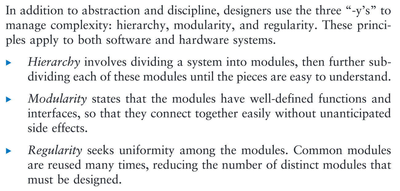 “the buffer might have desirable characteristics such as the ability to deliver large amounts of current to a motor or the ability to quickly send its output to many gates. This is an example of why we need to consider multiple levels of abstraction to fully understand a system; the digital abstraction hides the real purpose of a buffer.” (Harris and Harris, 2016, p. 31)