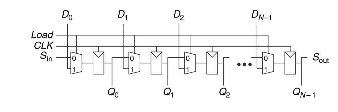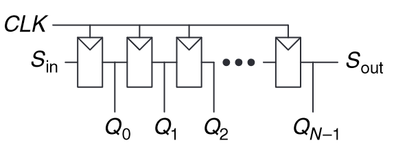 “A shift register has a clock, a serial input Sin, a serial output Sout ,andN parallel outputs QN−1:0, as shown in Figure 5.34. On each rising edge of the clock, a new bit is shifted in from Sin and all the subsequent contents are shifted forward. The last bit in the shift register is available at Sout. Shift registers can be viewed as serial-to-parallel converters.” (Harris and Harris, 2016, p. 270)