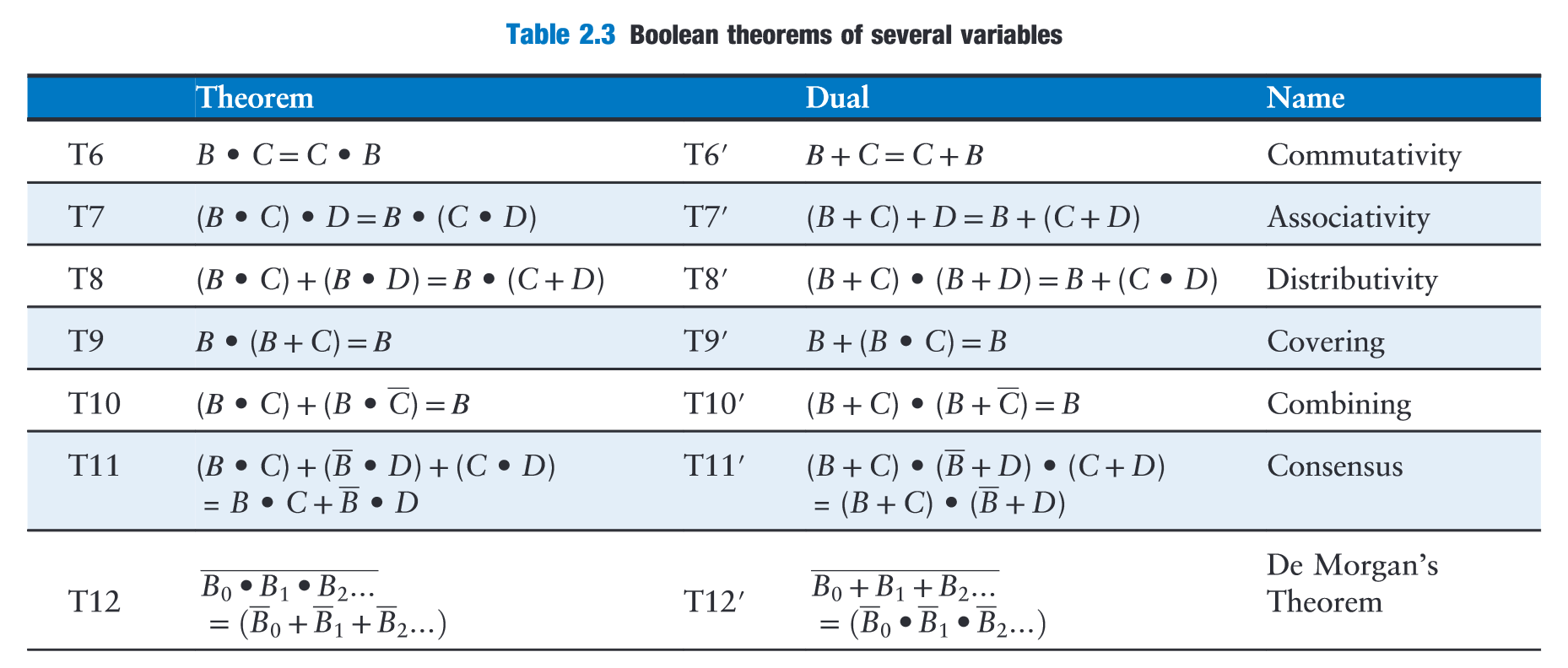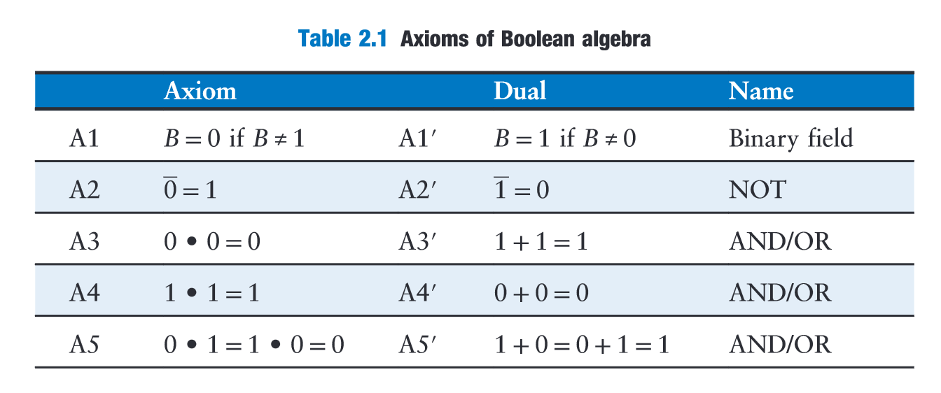 “Axioms and theorems of Boolean algebra obey the principle of duality. If the symbols 0 and 1 and the operators • (AND) and + (OR) are interchanged, the statement will still be correct.” (Harris and Harris, 2016, p. 71)