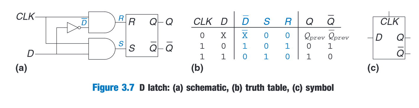 “The D latch in Figure 3.7(a) solves these problems. It has two inputs. The data input, D, controls what the next state should be. The clock input, CLK, controls when the state should change.” (Harris and Harris, 2016, p. 122)