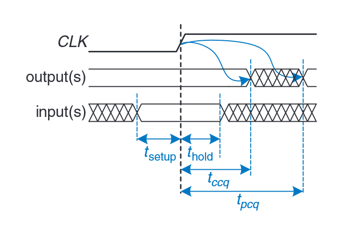 “Similarly, a sequential element has an aperture time around the clock edge, during which the input must be stable for the flip-flop to produce a well-defined output. The aperture of a sequential element is defined by a setup time and a hold time, before and after the clock edge, respectively.” (Harris and Harris, 2016, p. 150)