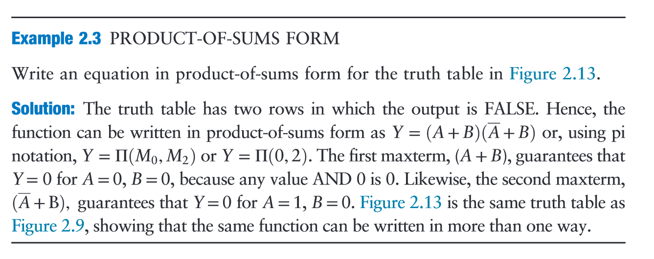 “An alternative way of expressing Boolean functions is the productof-sums canonical form. Each row of a truth table corresponds to a maxterm that is FALSE for that row.” (Harris and Harris, 2016, p. 70)