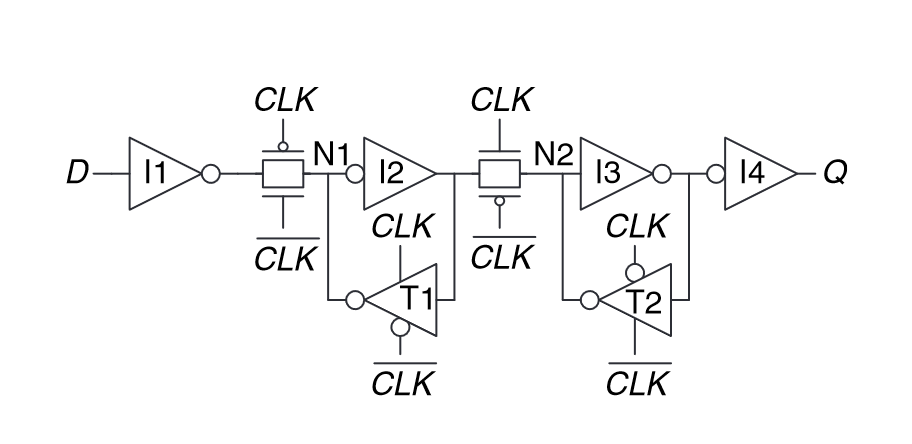 “A D flip-flop can be built from two back-to-back D latches controlled by complementary clocks, as shown in Figure 3.8(a). The first latch, L1, is called the master. The second latch, L2, is called the slave.” (Harris and Harris, 2016, p. 123)