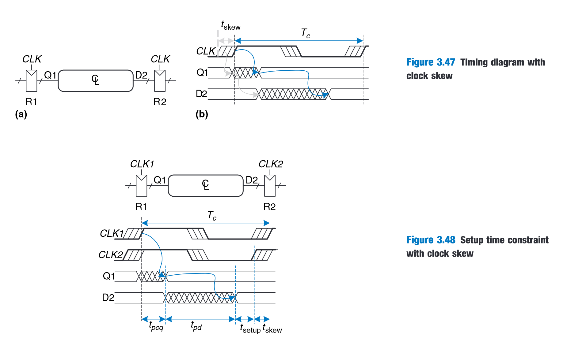 “In the worst case, R1 receives the latest skewed clock and R2 receives the earliest skewed clock, leaving as little time as possible for data to propagate between the registers.” (Harris and Harris, 2016, p. 157)
