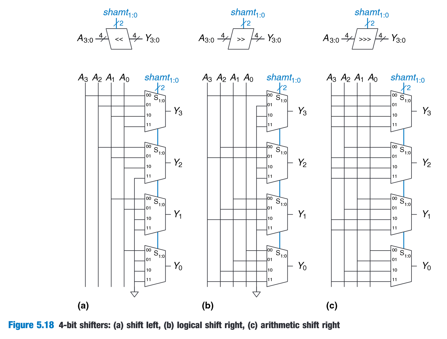 “The operators << , >>,and>>> typically indicate shift left, logical shift right, and arithmetic shift right, respectively.” (Harris and Harris, 2016, p. 260)