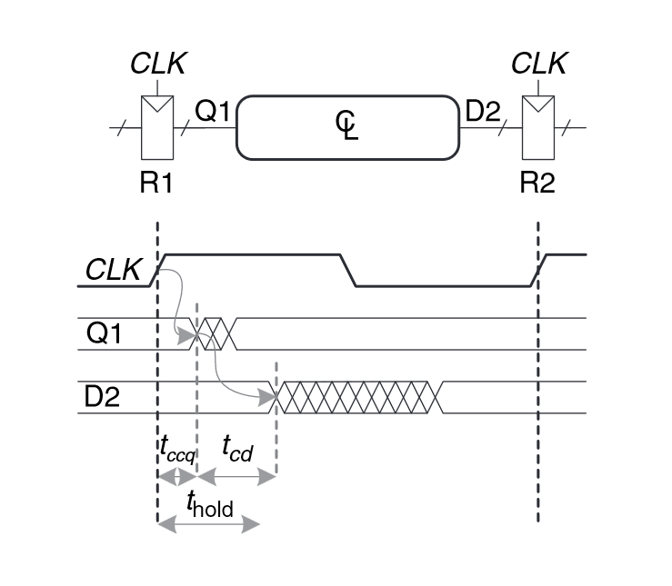 Hold time constraint. is the contamination delay between clock signal and the output of register R1. is the contamination delay of the combinational circuit’s output D. Since and are characteristics of the flip-flops, they are out of the circuit designer’s control, so the designer must ensure that the contamination delay of the circuit is great enough so that it only changes the output after the required hold time by the output register R2. Often, we can insert buffers to increase the contamination delay of the short paths to prevent a hold time violation as shown in the example at the end of 3.5.2.**