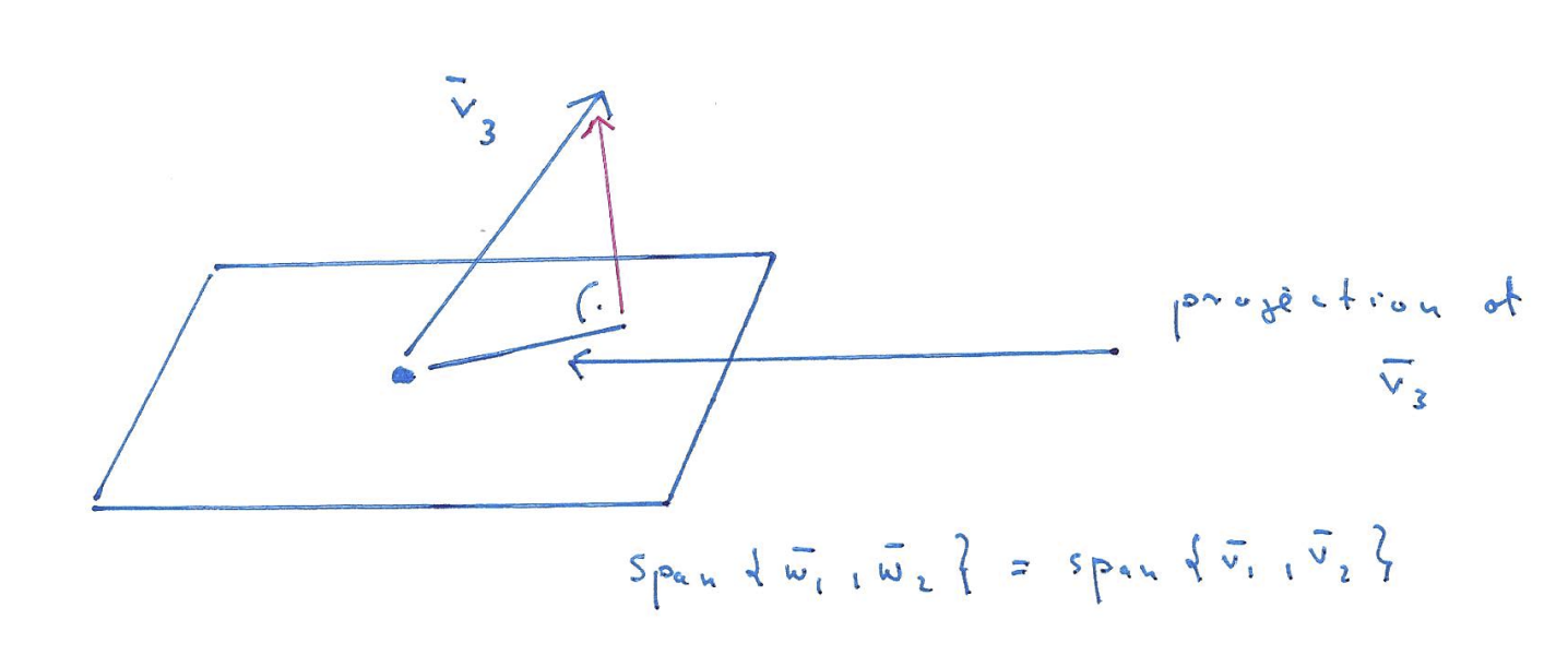 - To find a orthogonal to both and , form a plane with both vectors and subtract the projection of onto the plane from . In other words, . Note that projection onto the plane (with orthogonal basis vectors) can be split into projections onto and like so: .