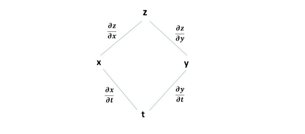 To draw a diagram for ∂t∂z, start from the initial function/variable, say z, which is defined in terms of undesired variables (say x and y). The diagram starts with z as the first node. Add the variables as children to the current variable’s node. Do this repeatedly to all the newly added child nodes (leaves) until they reach at the desired variable (t in this case). Each edge in the diagram represents a partial derivative (∂c∂p where p is the parent variable and c is child variable). For each possible path from the initial to the desired variable (z to t), multiply all the edges (e.g. z-x-t becomes ∂x∂z⋅∂t∂x). Sum all the paths together to get the desired partial differentiation (e.g. ∂t∂z=∂x∂z⋅∂t∂x+∂y∂z⋅∂t∂y).