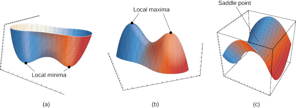 If f is a multivariate function, to determine whether z=f(x,y) has a minimum, maximum, or saddle point at the critical pointP=(x0,y0), we can use the second derivative test.
