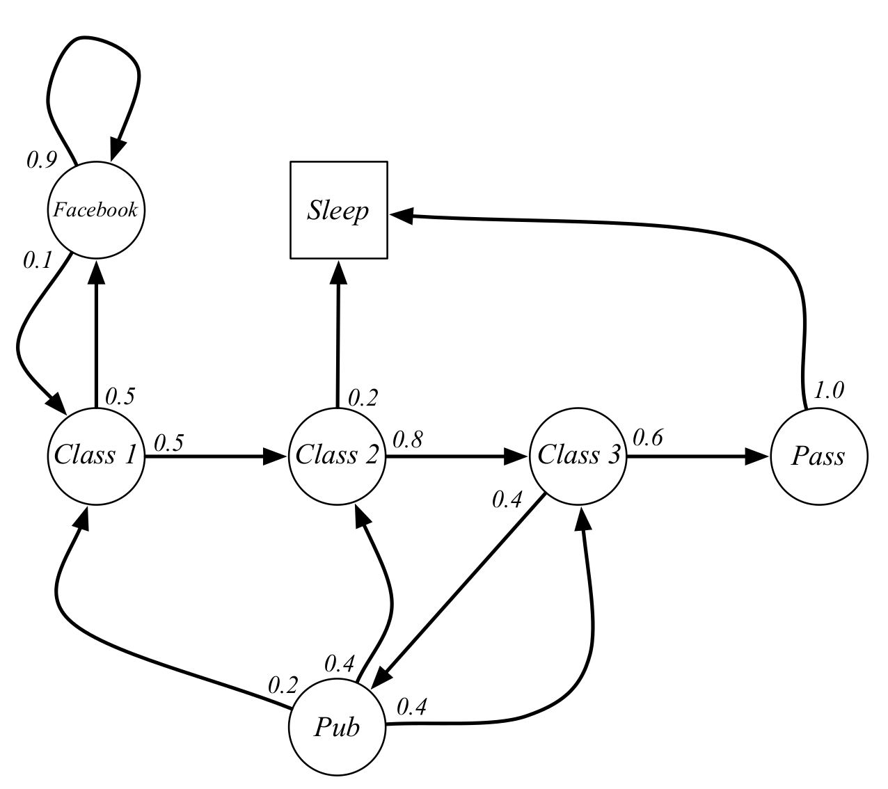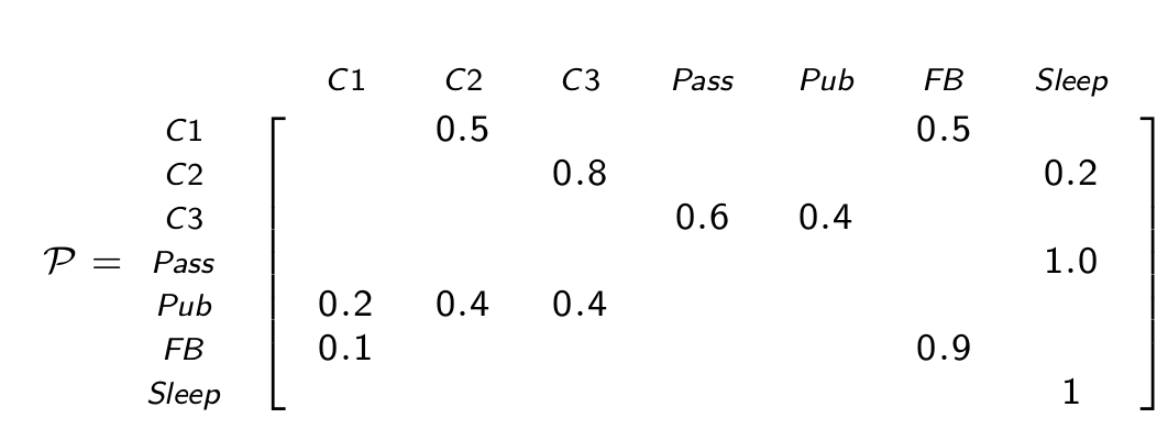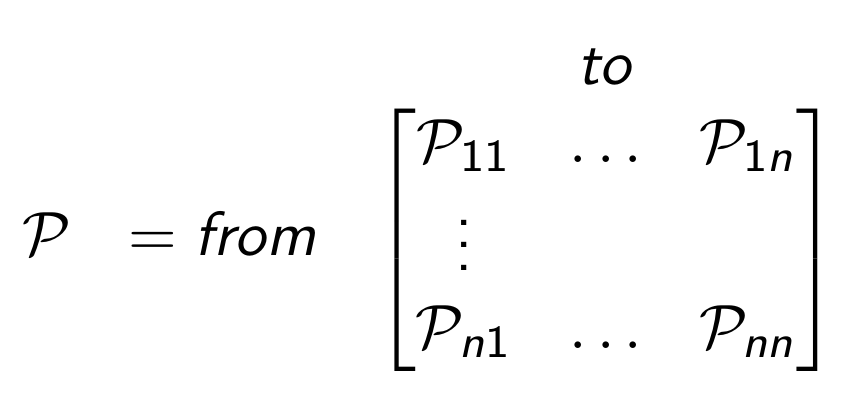 We can represent the transition probability function as a matrix. The row number is the source state, and the column number is the destination state. A row represents how likely a state can transition to some other state ; thus, the probabilities in a single row should sum to one. A sink in the Markov chain has , meaning that the state can only transition to itself and not any other state.