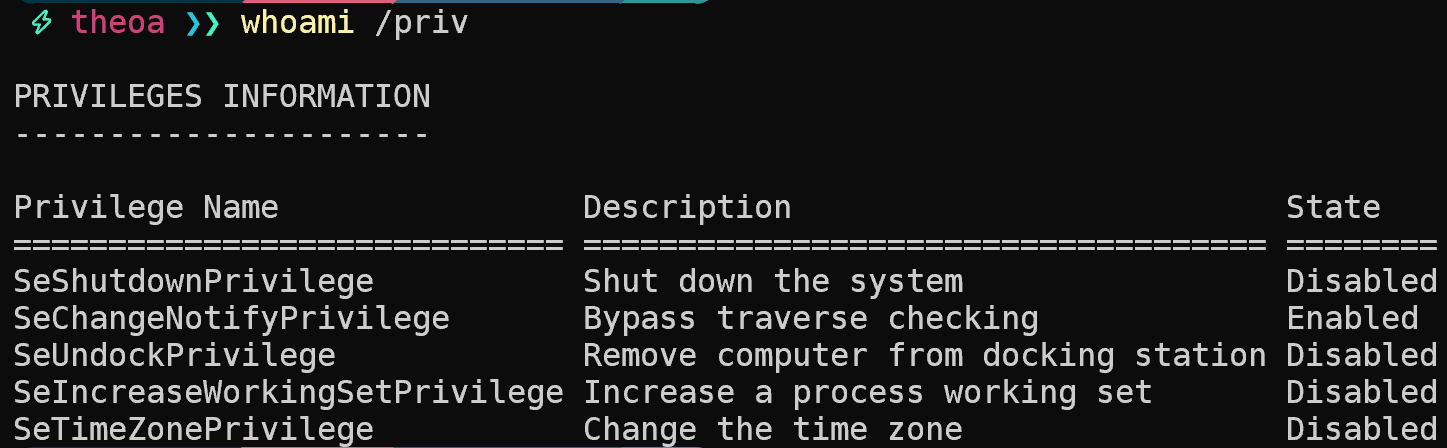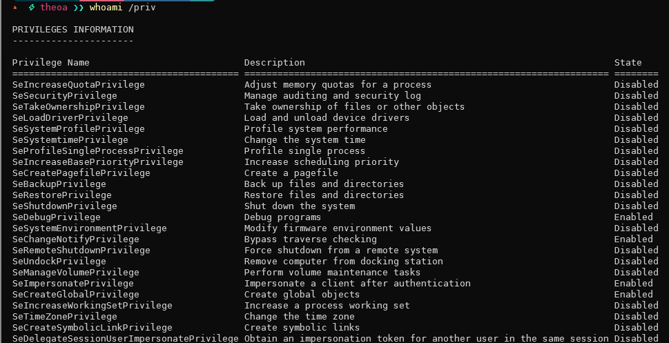 Now that you know what kind of privileges an administrator might have compared to a regular user, if you see any extra privileges (e.g., SeImpersonatePrivilege, SeDebugPrivilege, etc) being granted to a regular user or service account that you control, research it because it might just take us to SYSTEM.