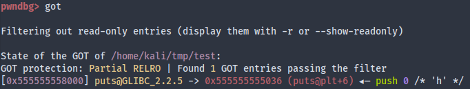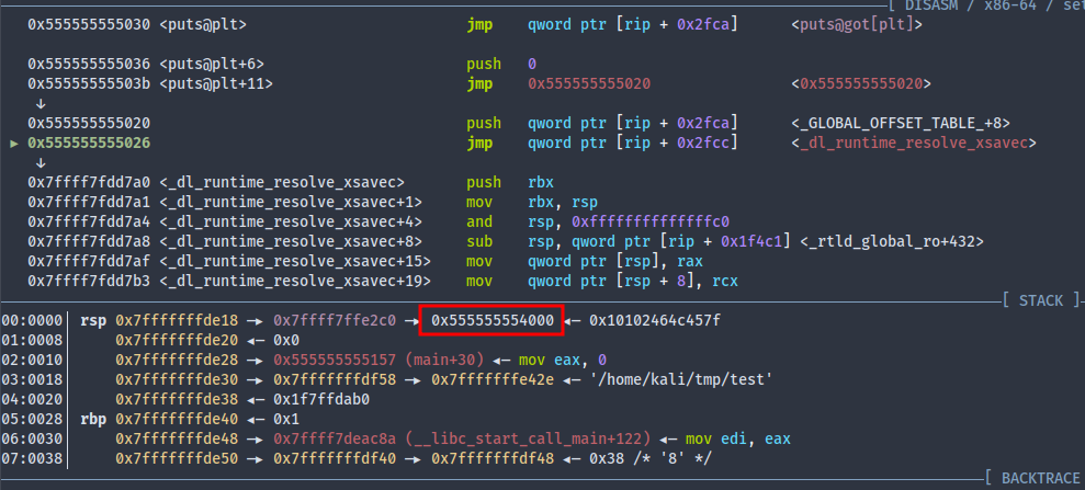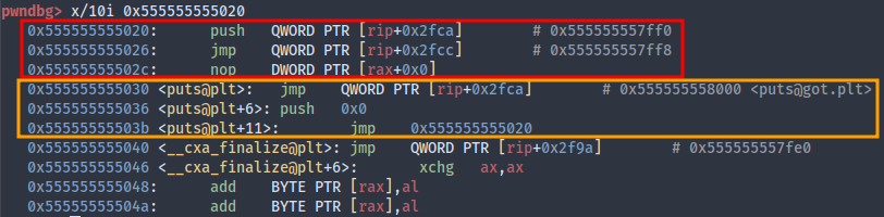 .pltand I was pretty confused as to howjmp QWORD PTR [rip+0x2fca]reads the content at 8000 instead of 7ffa. Dumb me. It turns outripalways points to the next instruction. So we would haverip+0x2fca=0x55555555036+0x2fca=0x555555558000whose memory points toputs@got.plt.