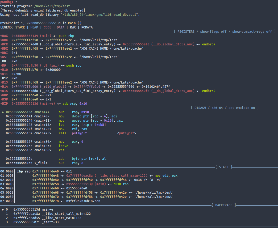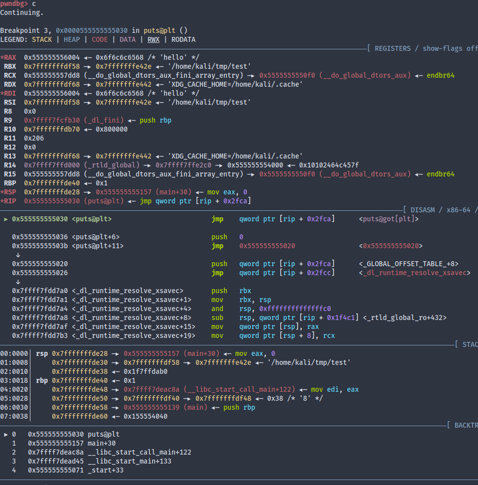 We can set a breakpoint on puts@plt and see what actually happens: