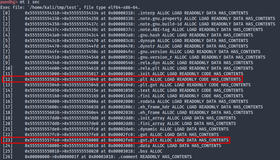 Let’s see how the PLT and GOT looks right now, manully for now; note that pwndbg does provide us with the commands plt and got which makes it easy to inspect. We are interested in these two sections: .plt, which jumps to the .got.plt entry, and .got.plt, which is the GOT section responsible for function symbol addresses.