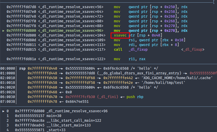 It turns out the xavec suffix of _dl_runtime_resolve stands for the xavec instruction, which saves processor state to memory. I’m not exactly sure what role it plays here. Perhaps reading the source code would help.