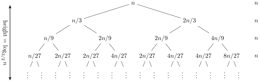 then we can build a recurrence tree like below, where each node represents the amount of work done at that node (in this case it’s , which is the subproblem size):