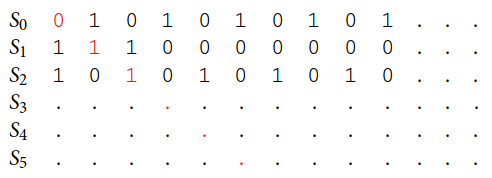For each , we flip one bit at index , leading to a diagonal of changes. We can build a new bit string by concatenating these flipped bits. This new bit string cannot be found in since for any element , is different by one bit at the -th position. This contradicts the earlier assumption that exists, indicating that is not countable.